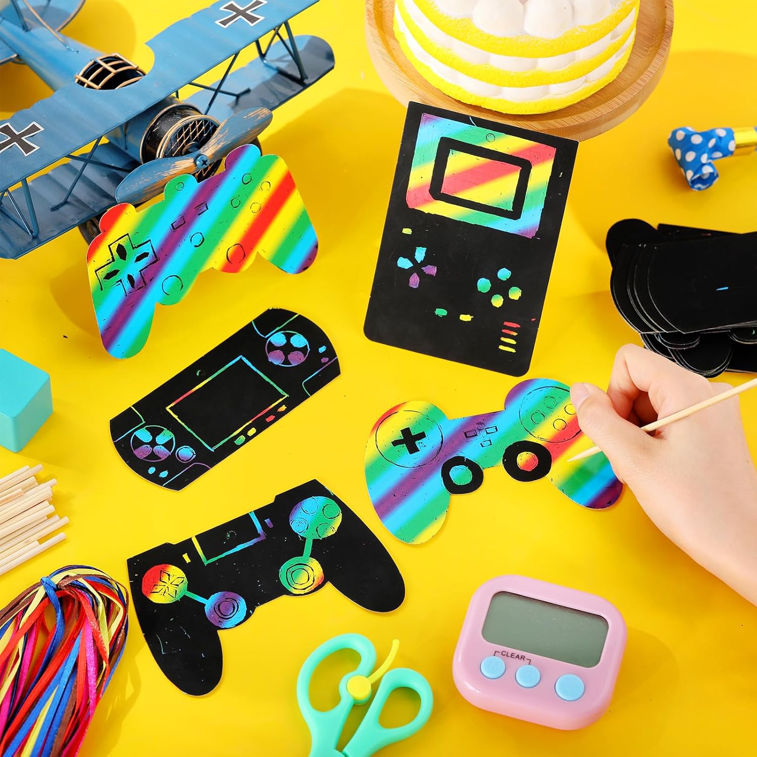 Elegant Design and High Quantity: these video game shaped scratch off cards come in a pack of 60 featuring 5 different shapes, along with 30 sticks, 30 pieces of ribbons and 3 sheets of dot stickers; This impressive volume caters to your numerous gaming parties, ensuring a standout party experience