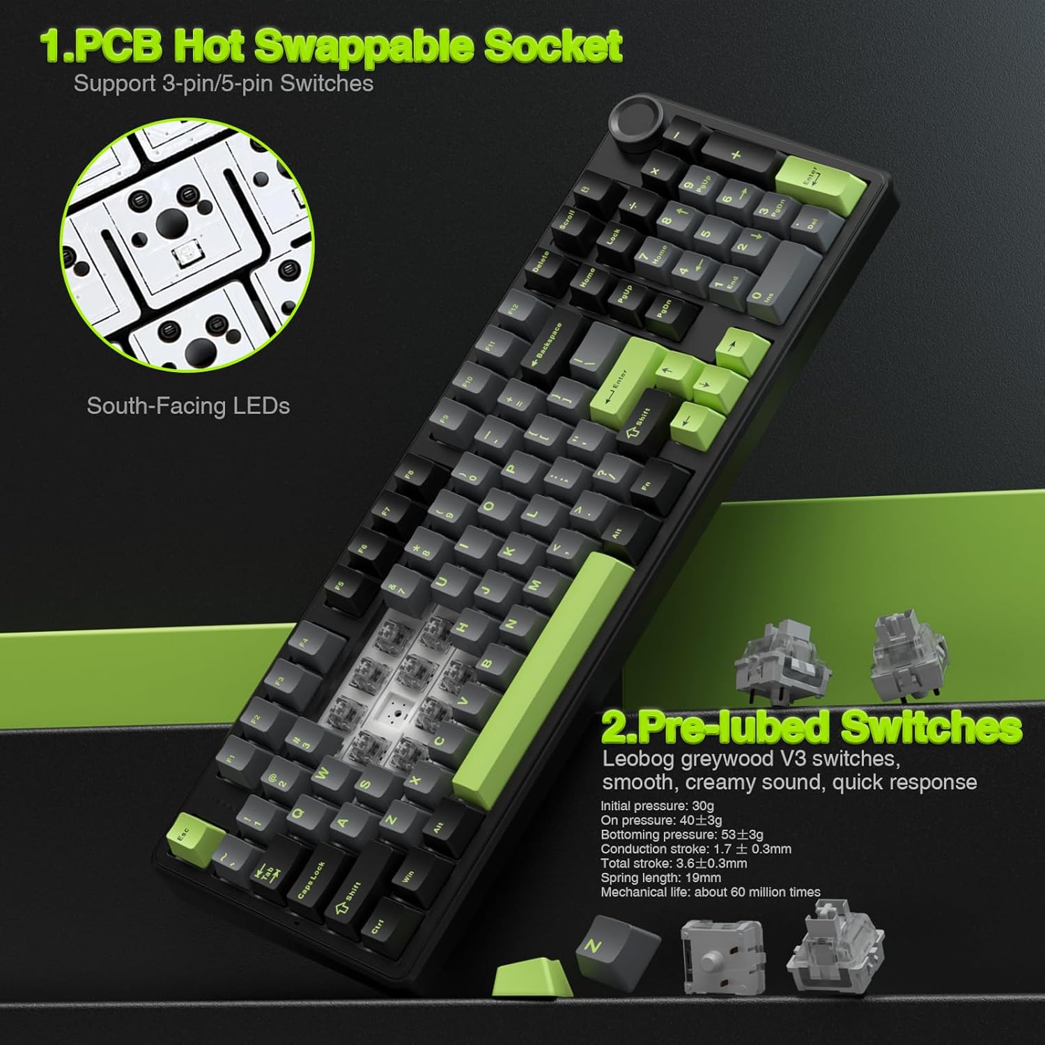 Hot-swappable Custom Keyboard: The switches and keycaps can be freely replaced(keycap/switch puller are included in the package).This customizable keyboard with hot-swap PCB allows users to replace 3 pins/5 pins switches easily without soldering issue. F99 Pro mechanical keyboards equipped with pre-lubed linear switches, bring smooth typing feeling and pleasant creamy sound, provide fast response for exciting game