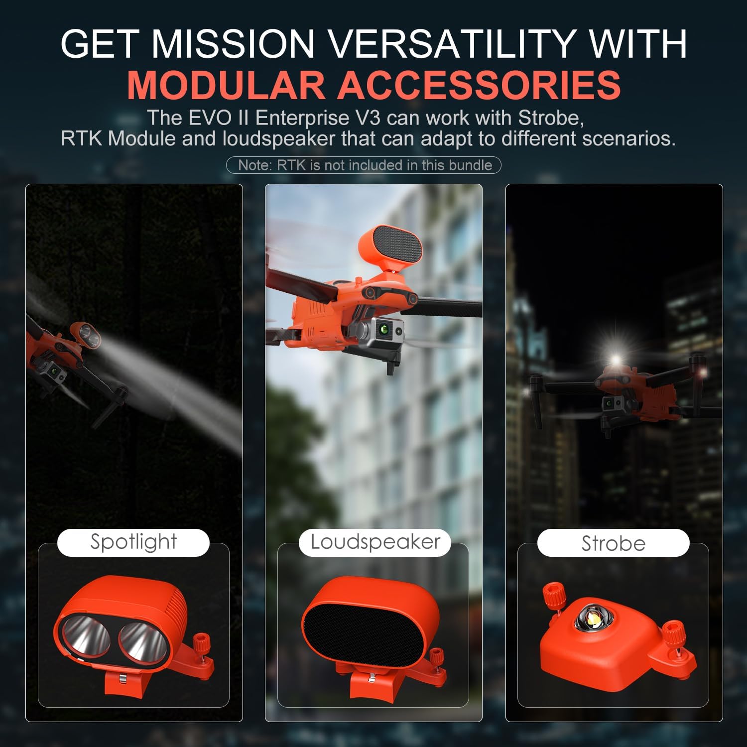🥇【ENTERPRISE ENVIRONMENTAL ADAPTABILITY】Autel EVO II Dual 640T Enterprise V3 can be bulked up with Strobe/Spotlight/Loudspeaker/RTK (RTK is NOT contained in this bundle) to meet different demands of professional missions. Autel EVO II Dual 640t Enterprise V3 can help you in every industry from firefighting to construction with the -10℃ to 40℃ operating t~emperature, such as Public Safety, Search&Rescue, Traffic Super-vision, Power Inspection, Firefighting, Disa-ster Response, Mapping and so on.