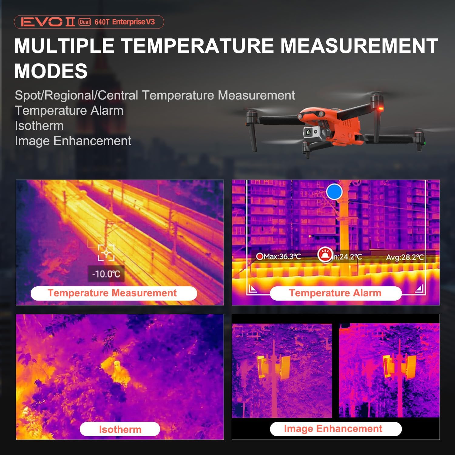 🥇【A NEW GENERATION OF T~HERMAL IMAGING SENSOR FOR MULTIPLE TEMP MODES】Autel EVO II Dual 640T Enterprise V3 t~hermal imaging sensor has a resolution of up to 640×512@30 fps. It also comes with a 13mm lens, 16x digital zoom, and is capable of recognizing subjects at distant. The built-in infr-ared sensors and high-speed processors, provides a variety of t~emp m~easurement functions, easy to catch data: Spot/Regional/Central/Temperature Alarm/Isotherm/Image Enhancement.