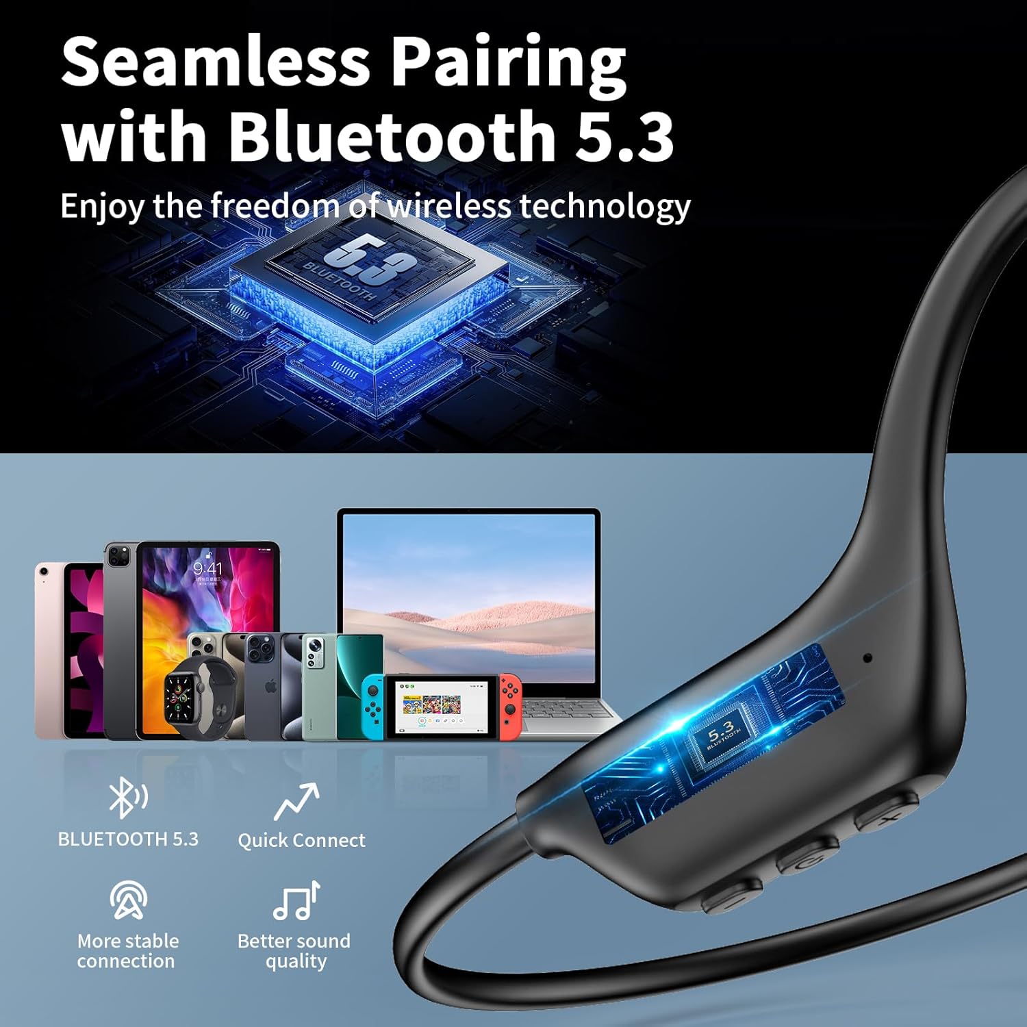 Bone Conduction Headphones -Conduction headphones through the bone transfer sound, not blocking the ear canal, in the use of the outside world can be heard at any time. Can effectively avoid the safety hazards caused by the isolation of external sound