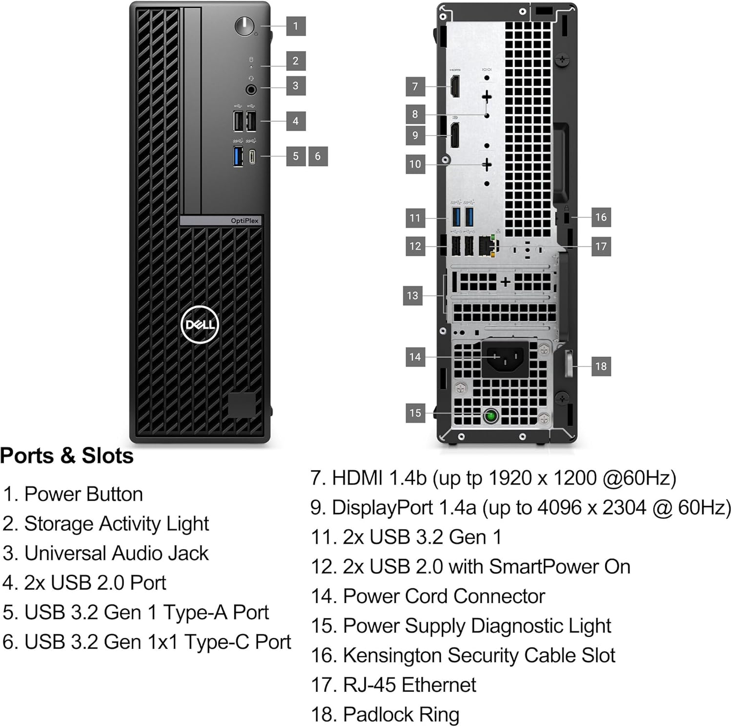 ■ Note: No Built-in W-i-F-i ■ USB WiFi Adapter for PC. Front Ports: 2 USB 2.0 (480 Mbps) ports, 1 USB 3.2 Gen 1 (5 Gbps) Type-C port, 1 USB 3.2 Gen 1 (5 Gbps) port, 1 Universal audio jack; Rear Ports: 2 USB 2.0 (480 Mbps) ports with Smart Power On, 2 USB 3.2 Gen 1 (5 Gbps) ports, 1 DisplayPort 1.4a (HBR2) port, 1 HDMI 1.4b port, 1 RJ45 Ethernet Port 10/100/1000 Mbps.
