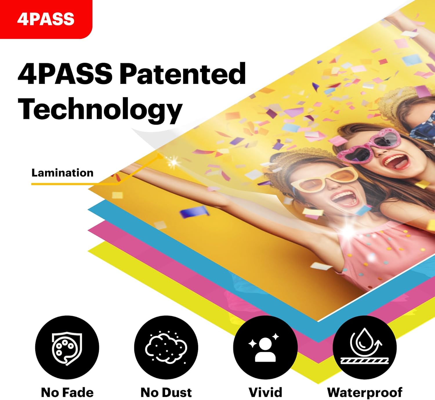 Superior photo quality; Kodak 4PASS technology to print flawless photos in layers of color with a laminating process, making them fingerprint proof, water resistant, and lasting for generations