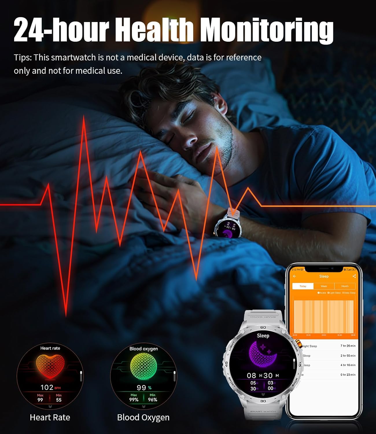 【BUILT-IN LED LIGHT】: The round smartwatch is equipped with a practical LED light that supports constant and flashing modes, providing good illumination whether you’re walking at night, camping, or in a power outage emergency. Simple operation allows you to walk confidently in any environment.