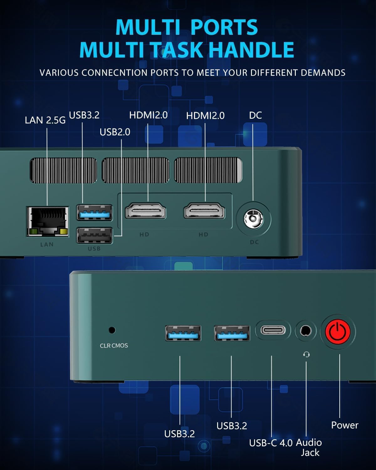 SEAMLESS SETUP AND CONNECTIVITY: Setting up is a breeze with the mini desktop pc MX70. Simply plug it into your monitor, keyboard, and mouse, and you’re ready to go. Enjoy 3x USB 3.2, 1x USB 4, 1x USB 2.0, 2x HDMI 2.0, 1x 2.5 Gigabit Ethernet port, and stay connected with WiFi 6E and Bluetooth 5.2